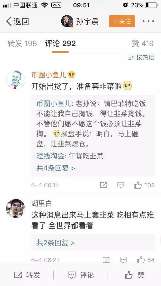 有人表示乐观,认为此波流量可能会给币圈带来新韭菜。比如,币圈大v区块链威廉就在币乎发文称,自己买了十万波场来真金白银地表达对孙宇晨的支持,因为孙宇晨“花钱去到主流金融圈和传统领域宣传加密货币和区块链,让人们不要对加密行业有这么深的误解和之一,明白这里不是一群妖魔鬼怪,而是一群充满着理想和情怀的人们”。