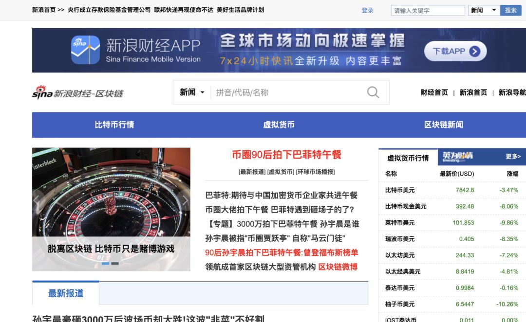 不仅报道,还都是C位出现。以新浪财经板块为例,该新闻在新浪美股新闻板块位列要闻前五;在新浪区块链新闻板块占据头条;而在北美版的新浪财经中更是热点专题类头条。此外,券商中国、每日经济新闻、华尔街见闻、界面新闻等诸多财经类媒体均对此事进行了头条报道,甚至是APP消息推送。区块链媒体更是家家报道和推送。