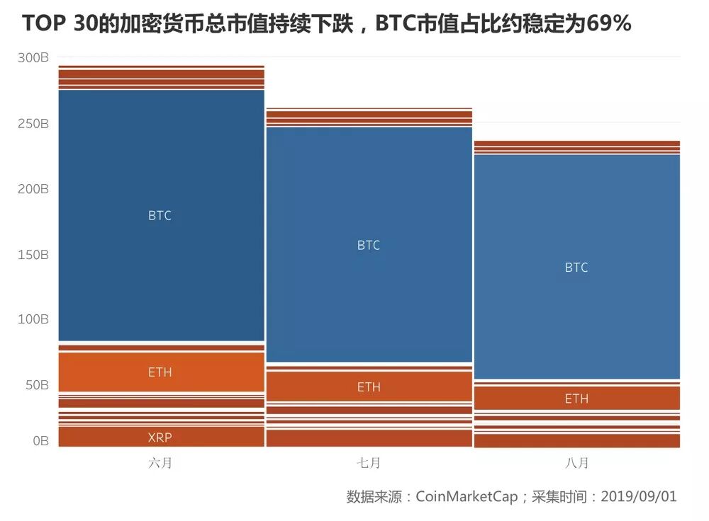 在这一观察期内,虽然TOP 30的总市值持续下跌,但BTC在其中的市值份额持续上升,从6月的65.56%上涨至8月的72.42%,过去180天的平均市占率约为68.94%。