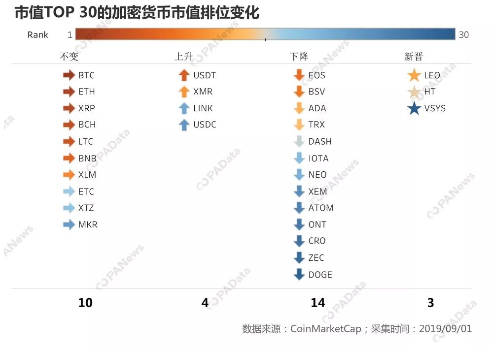 如此前观察,市值TOP 30的加密货币总体格局是基本稳定的,90%的加密货币都是“常客”。本次观察期内(2019/06/01-2019/08/31,以下简称“本次观察期”)仅有3个加密货币新晋入榜。