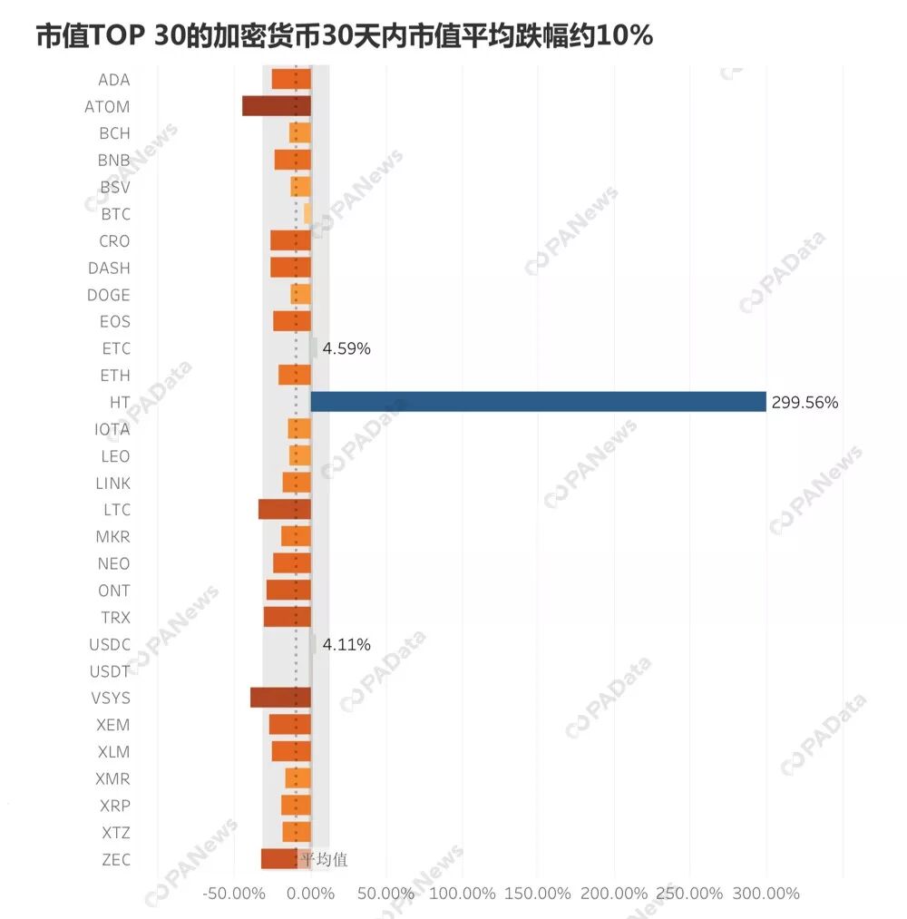 在大盘市值下跌趋势中,只有HT、ETC、USDC的市值在过去30天内上涨,其中HT独领风骚,30天内市值上涨约299.56%,和上一观察期内的BSV差不多(6月初,BSV在30天内市值上涨309.34%)。除此之外,只有ETC的市值上涨了4.59%和USDC的市值上涨了4.11%。30个加密货币的市值在过去30天内平均下跌了10%左右,这与上一观察其市值普涨33%形成了鲜明对比。