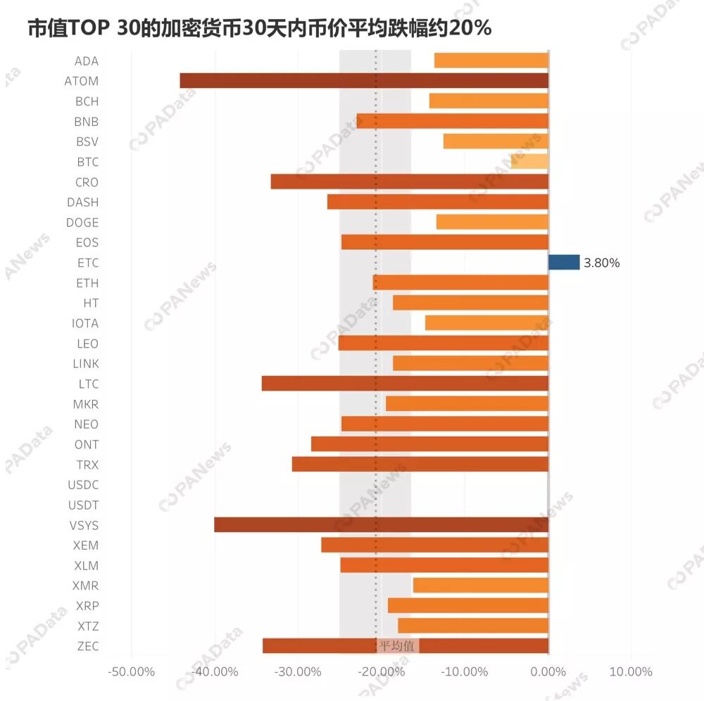 不仅市值齐跌,过去30天内的TOP 30的币价平均跌幅约为20%。其中,在不包含稳定币的情况下,除了ETC的币价逆势上涨了3.8%以外,27个加密货币全线下跌。跌幅最高的ATOM和VSYS在过去30天内币价纷纷下跌超过40%,看来明星项目也无法摆脱公链主网上线,币价就暴跌的魔咒。 另外CRO、LTC、ZEC和TRX在过去30天内币价跌幅都超过30%,是TOP 30中币价下跌较多的几个加密货币。