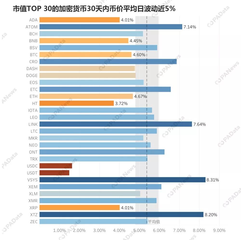 但是,在主流币市值币价齐跌的时候,TOP 30的币价波动并不剧烈。过去30天内,TOP 30的币价平均日波动率约为5%。