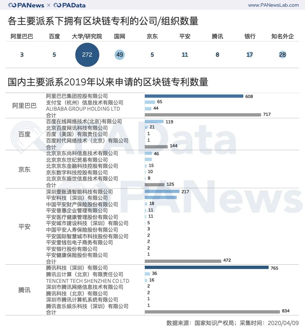 根据不完全统计,BATJP五大集团下公开区块链专利的公司共有32家,2019年以来共计公开2292个区块链专利,占总数的26.43%,而且每个集团2019年以来公开的专利数都超过了100个,相当于进入专利数量的TOP 10。