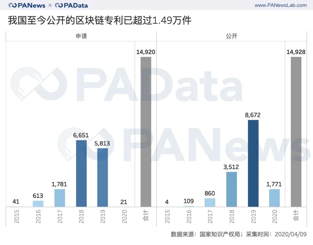 根据统计,我国至今申请和公开的区块链专利都已超过1.49万个。 其中2018年是申请区块链专利最多的年份,共计6651个区块链专利,环比增长273.44%,2019年虽然申请量有所下降,但也达到了5813个,环比下跌约12.60%。但在2020年已过去的3个多月里,区块链专利的申请量只有21个,远远低于前两年月均值,但这或因专利申请和审核都受到疫情影响。