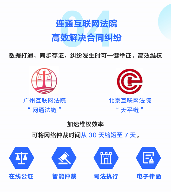 这两项区块链应用均实现了与互联网法院数据的打通,一旦发生纠纷可一键举证,将网络仲裁时间从一个月缩短至7天,大大提升维权效率。