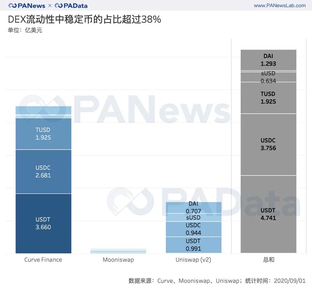 另外值得关注的是稳定币成为了AMM DEX流动性挖矿的主要“种子”。根据统计,截至9月1日,Uniswap v2、Curve和Mooniswap三大DEX中的稳定币流动性最规模达到了12.47亿美元,相当于总流动性的38%左右。
