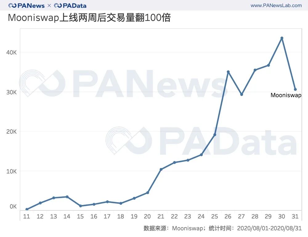 8月币本位交易量涨幅最大是Mooniswap,近乎翻了100倍,从上线初(8月11日)的318.09ETH暴涨至3.06万ETH,一举超过老牌的Kyber。