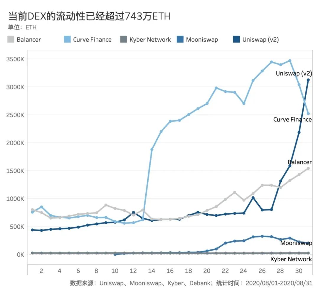 根据统计,截至8月31日,Uniswap v2、Curve、Balancer、Mooniswap和Kyber的流动性总量约为743.10万枚ETH[3],相当于32.41亿美元。