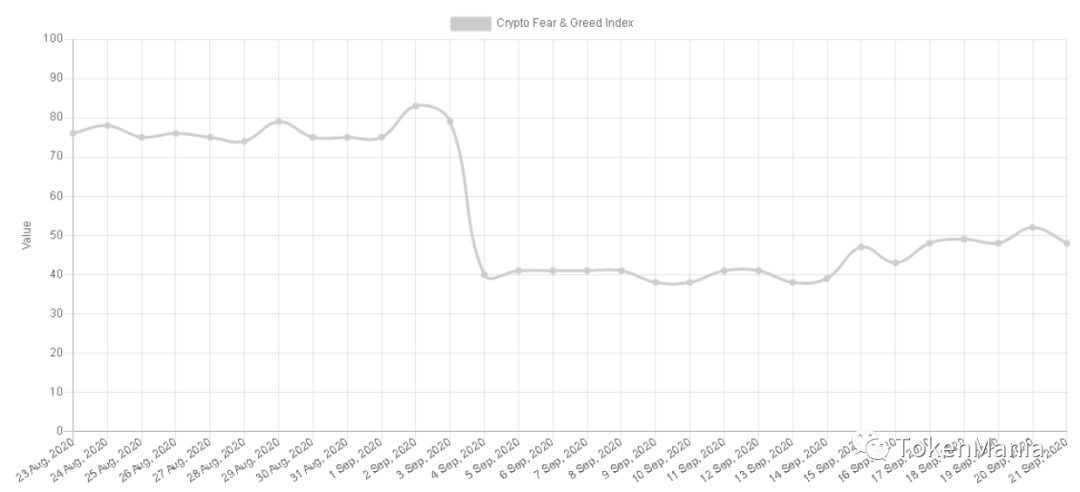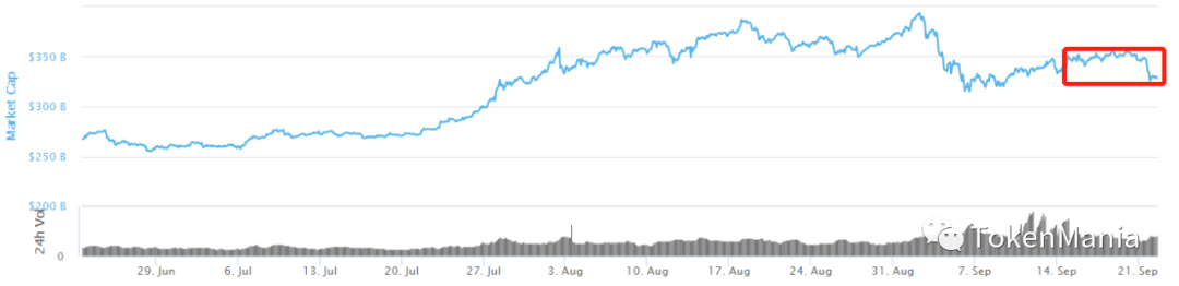 本周大盘受外围市场影响承压下挫,大中小市值币种全面回调,投资者情绪由中性转为恐惧。周初大盘维持3400-3600亿美元附近窄幅震荡,最高触及3551亿美元,9月21日晚间大盘急跌回落至3260亿美元下方,而后弱势反弹尾盘收报 3290亿美元上方,总市值日均值较上周同期上升1.76%。外围市场方面,美联储9月最新利率决议符合市场的普遍预期,但未给出进一步经济刺激的承诺,受北半球秋冬疫情进一步恶化担忧以及美国选情的不确定性影响,9月21日除美元维持强势外全球资产普跌,欧美股市大幅下挫,COMEX黄金期货跌逾2%,创两个月以来新低。