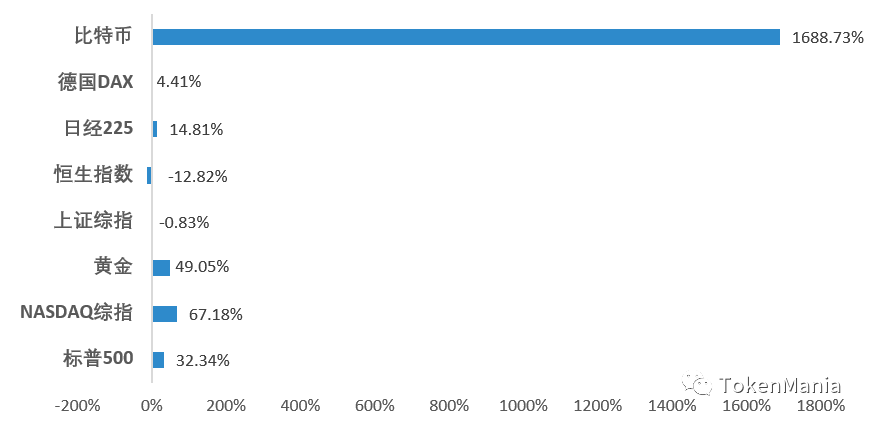 对近三年各类资产的动态收益率进行比较,比特币的收益表现一枝独秀。最近三年比特币动态收益率为1615.69%,位居各类资产首位,同时与其他资产的收益率有较大差距。除数字货币以外,其他资产收益率表现分化,美股表现相对较好,标准普尔500指数涨幅32.34%,纳斯达克综合指数涨幅67.18%;此外上证综指涨幅-0.83%,黄金涨幅49.05%。