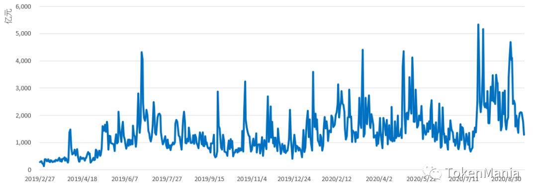 从更长的时间维度来看,2020年初至2月底,减产预期作用下市场积极向好,量能同步放大;3月疫情全球扩散,全球资本市场出现大幅波动和恐慌性下跌,流动性危机之下加密资产亦受重创,日成交量最高达4000亿元;随着全球多国政策持续发力,强刺激下全球资产逐渐探底企稳,全球风险偏好逐步修复,加密市场抄底资金托底迹象明显,恐慌性下跌结束后,九大交易所成交量降至2000亿元以下;比特币减半前市场量价有所增长,但减半完成后的一段时间内市场反应平淡,波动收窄,整体处于区间震荡,成交量呈下行趋势;经历数周区间调整后,BTC价格突破12000美元,但随后又震荡回调,本周九大交易所日均成交量1884.76亿元,较上周下降89.30亿元,降幅为4.52%。考虑到目前各大交易所存在刷量的行为,实际成交数据可能低于统计数据。