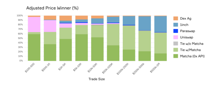 0x API提供的调整后价格在72%的情况下优于其它聚合器。平均来看,0x API在70%的情况下表现优于其它交易所。也就是说,使用0x API聚合器(如 Matcha)的交易者获得所有DEX最佳价格的概率是70%。