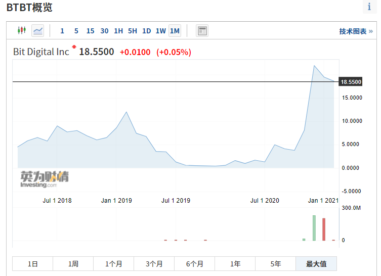 信息显示,Bit Digital 买入了大概 17,996 台矿机 (全部是蚂蚁矿机或神马矿机)。这一消息,助推这家公司的股票价格持续飙升,从 2020 年初至年底,BTBT 的股票价格涨幅超过 1800%。