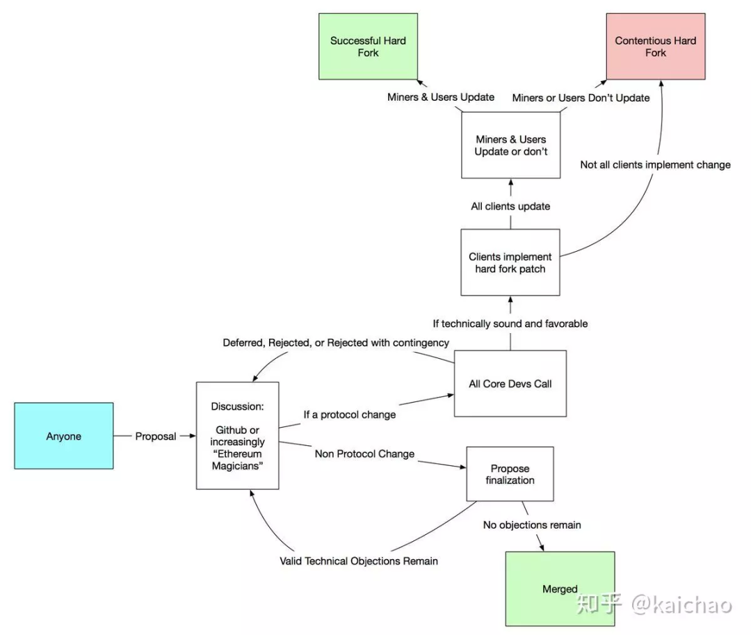 一旦客户端发布,客户端开发者和/或他们的支持者会向用户做公告,用户会选择是否更新客户端,或者可能切换客户端。用户通常会将这一决定委托给第三方,如Infura或中心化交易所,但最终用户可以决定他们想要在什么哪里进行交易。在委托投票的情况下,如果他们不同意他们的委托人,他们通常可以切换供应商(这对于托管委托来说有点棘手,因为托管人可能会拒绝把你的钱交给托管人不同意的链上)。