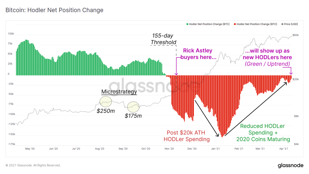 因此,机构在2020年底和2021年初购买的币很可能开始成熟,超过155天的门槛(假设他们以真正的Rick Astley风格坚持下去)。因此,持有者持仓变化指标目前呈上升趋势,如果这些机构买家确实进行了坚定持有,那么很可能在未来几个月内继续保持这一轨迹(请记住,从购买到比特币最终进入其最终冷钱包,会有一个时间差)。