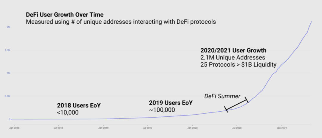 DeFi的增长可以用多种方式表示,最直观的是衡量活跃用户。自DeFi实验初期以来,用户的增长是爆炸性的,自2018年初以来,以某种方式与Ethereum DeFi互动的地址超过210万。