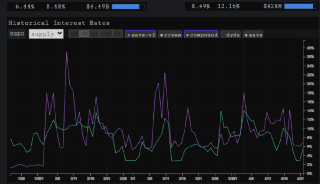 套利者会把他们的存款和借贷资本转移到任何可以找到优越利率/风险和回报的地方。参与低流动性市场存在风险溢价。利率倾向于平滑化和正常化,正如随着时间的推移,Compound和Aave之间的USDC利率所示。新的流动性挖矿计划和其他影响会带来新的利率波动。