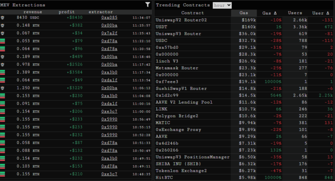 在下面的左图中,我们看到了MEV机器人通过各种手段从网络中提取价值的一个小时的活动。在下面的右图中,我们看到在暴跌期间的一小时内,对Gas消耗贡献最大的智能合约。