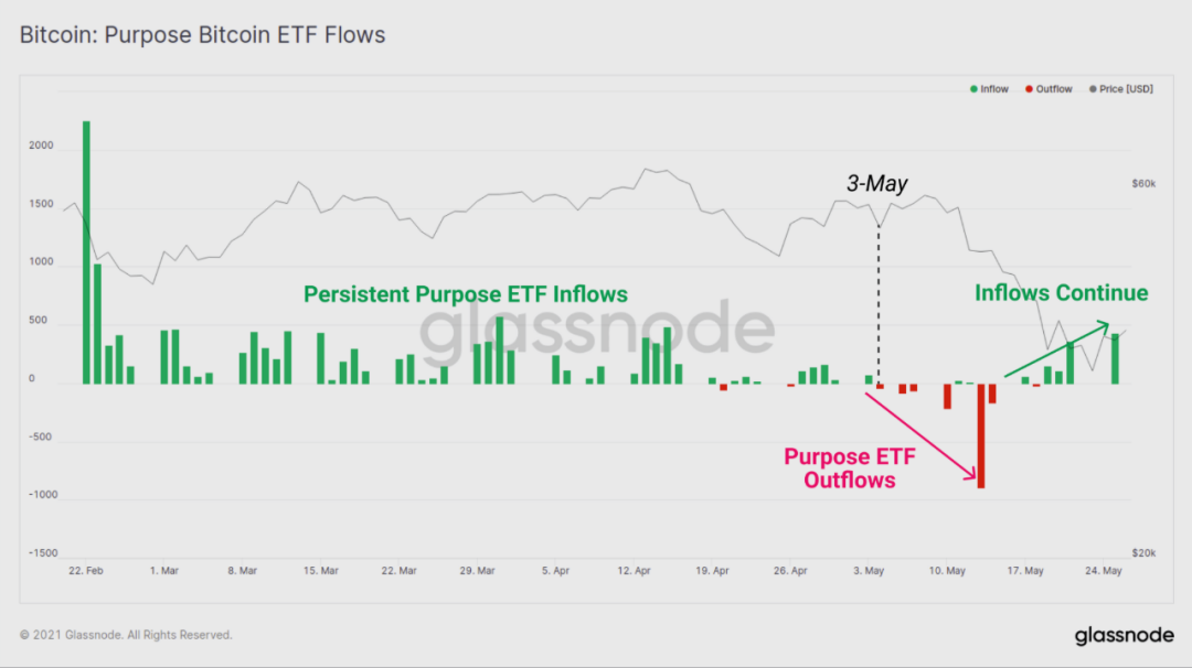 GBTC和Purpose ETF的流入量都表明,从2月到5月,机构需求已经疲软,这两个产品都会对流动的BTC供应产生影响。从积极的方面看,最近的抛售似乎激励了这两种产品的投资者,因为GBTC的折扣增加,而Purpose ETF的流入也重新开始了。