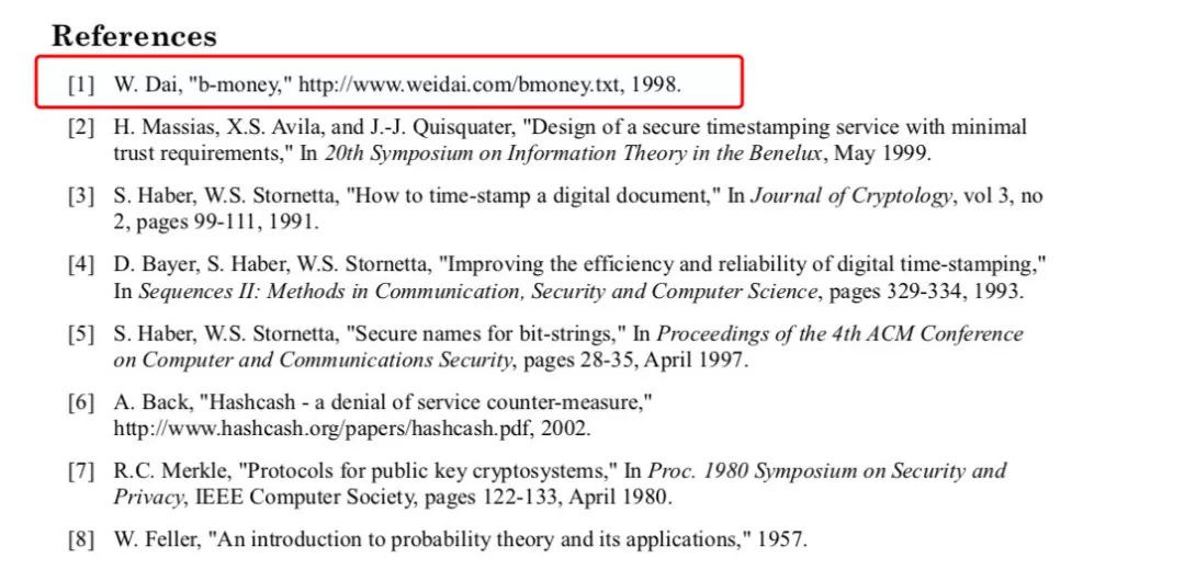 早在 1998 年,华裔科学家戴伟(Wei Dai)便提出了匿名分布式电子加密货币 B-Money,中本聪设计比特币时很多地方借鉴了 B-Money,比特币白皮书文末列出的参考文献中第一篇就是戴伟(Wei Dai)的文章。