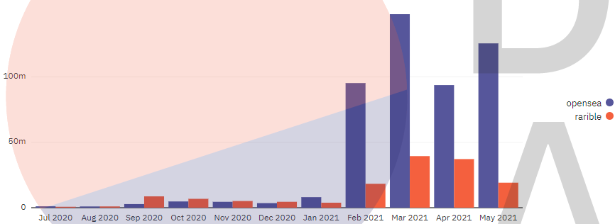 图5-2 OpenSea与Rarible每月成交额对比