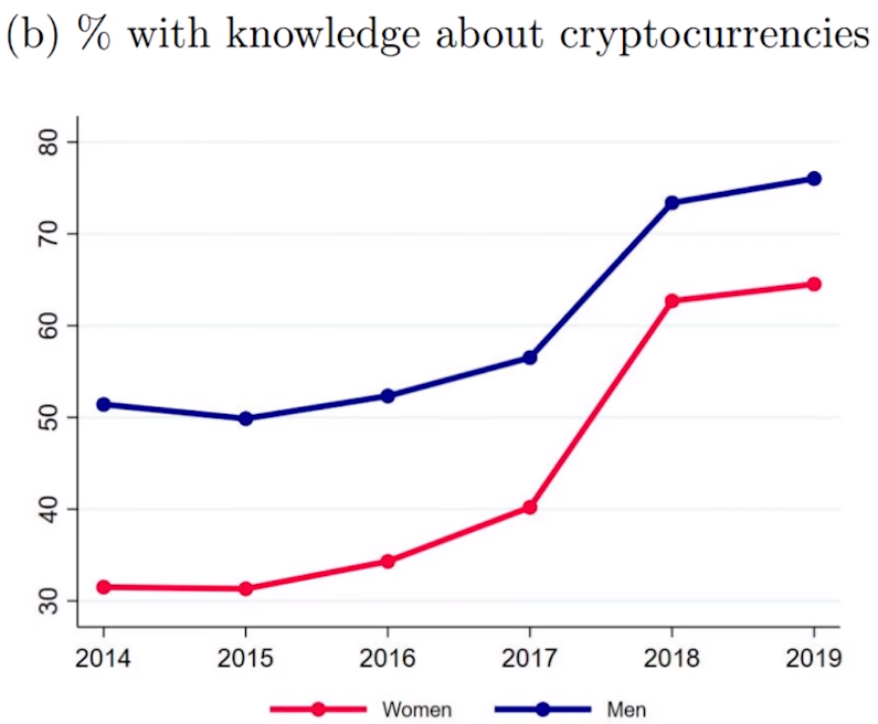 我们可能会认为女性投资者对加密货币并不那么感兴趣,但显然,情况并非如此。了解加密货币的女性比例基本上与男性相当,准确地说是 65% 到 75%。