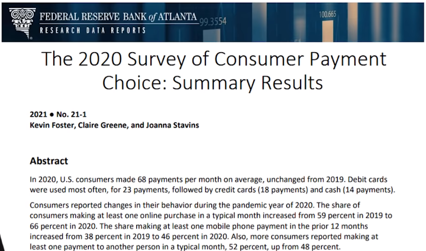 然而,能够解释这种差异的是国际清算银行使用了 2019 年美国消费者支付选择调查的数据。亚特兰大联邦储备银行进行的年度调查。