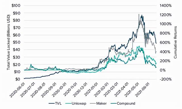 图1: DeFi 累积投资回报率VS.锁定的总价值(TVL)