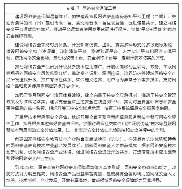 1.加强网络安全保障。完善网络安全管理体系,健全网络安全制度设计。推进网络安全技术产品化、服务化、产业化,提升商用密码应用深度和广度。深化新技术新产品应用,提升网络安全态势感知、监测预警、分析研判和应急处置能力。加强工业、交通、金融、财税等重点领域关键信息基础设施防护,做好信息共享和预警通报。常态化开展网络安全防护检查和应急演练,增强安全风险“发现力”“防护力”和“处置力”。建设一流网络空间安全学院,组织开展“湖湘杯”网络安全技能大赛。加大宣传培训,提升全社会网络安全意识和防护技能。