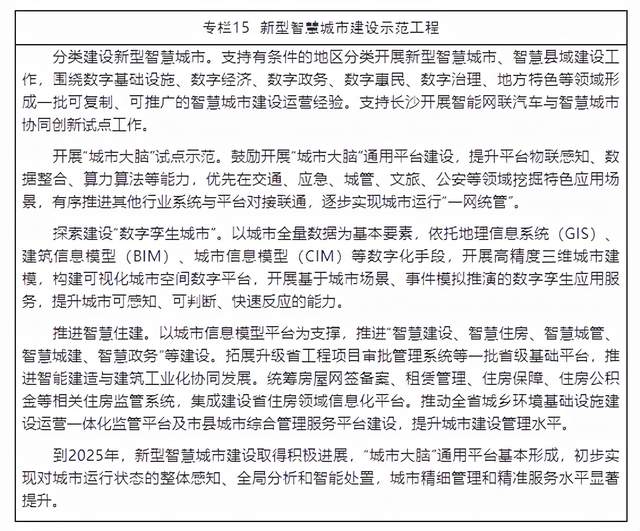 6.区域信息化发展高效协同。智慧城市建设稳步推进,数字乡村建设取得显著成效,建成一批新型智慧城市和数字乡村试点示范,城乡“数字鸿沟”逐步缩小。长株潭智慧城市群建设持续深入,基础设施互联互通、公共服务共建共享能力不断提高,与粤港澳大湾区、长江经济带等重点区域的协同联动水平进一步提升。