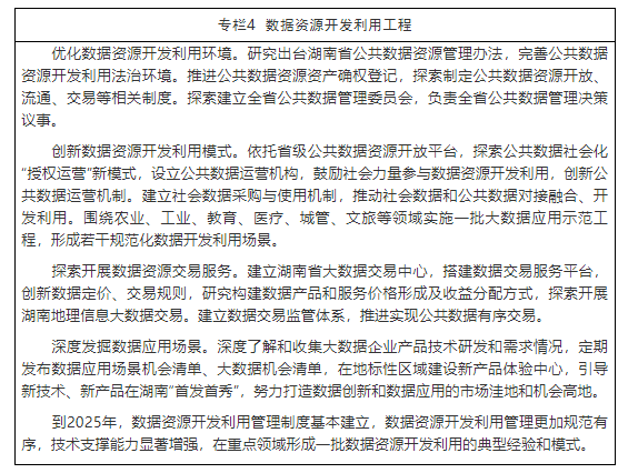 4.加速培育数据要素市场。推进数据标准化、资产化和商品化体系建设,探索建立数据资源统一登记确权体系,完善数据市场监管和数据安全保障机制。鼓励高校、科研机构和各类企业加强技术创新,利用数据资源开发各类产品和服务。引入数据分析服务机构,建立数据运营机制,构建数据服务生态,提升数据分析应用水平。稳步推进数据要素市场化配置,建设湖南大数据交易中心,探索构建规范有效的数据要素交易流通模式,培育数据交易市场。