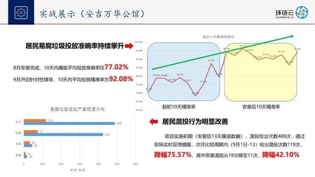 安装后,效果明显。具体包括小区垃圾收集站现场干净整洁,恶意混投消失;在投口内安装检测模组,全天候的对垃圾分类进行检测;设置智能喇叭,提醒居民破袋投递,对投错及时语音提醒;报送违规信息到执法系统,为监管部门提供完整执法证据链。
