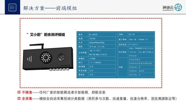 艾小厨解决方案主要解决了3方面的问题。首先是机器换人。机器替代人工督导,全天候24小时监督和指导,提高居民垃圾投放的合格率,推动群众习惯养成。同时大幅度降低政府支出。其次是数据赋能。借助5G、大数据分析、人工智能技术,全程取证自动分析,加快构建以法治为基础的环境保护政策落地。最后是促进改革。利用人工智能技术对居民的各类生活垃圾重量、分出率进行精确测算和指导,为生活垃圾收费奠定基础,助力实现碳达峰碳中和。