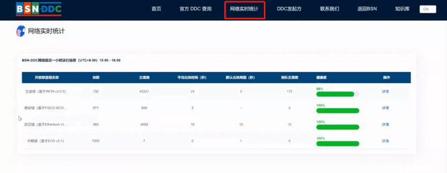 接下来还是讲一下DDC网络近期的一些进展和计划,我们也是一直在努力把DDC网络做得更好,为平台方以及平台方的终端用户提供更好的服务。最近我们即将在DDC官网做一个更新。更新后,在官网首页右侧将会出现一个表格,显示一小时内DDC网络上各条开放联盟链的运行情况(健康度),包括出块效率、排队数等。每条链后面有“详情”按钮,点击按钮,可显示这条链过去一小时的详情数据。