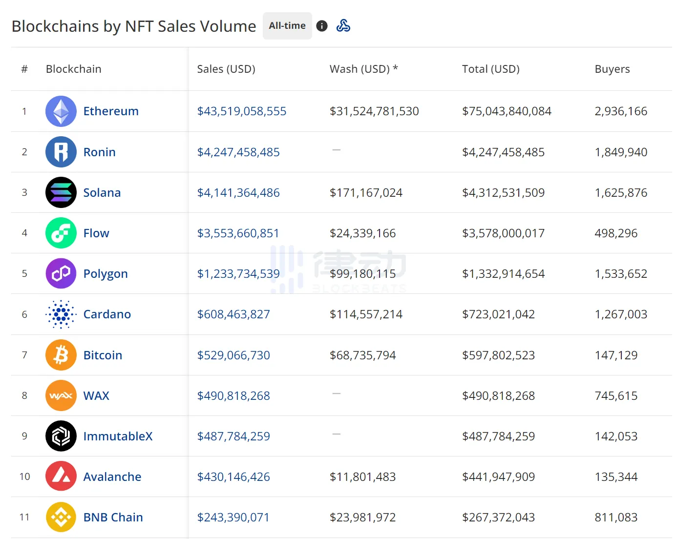 其实,Polygon NFT 市场的历史总成交量在所有区块链网络中排名第 5。如果我们把 Ronin 这样的「Axie 游戏链」和 Flow 这样的「NFT 专链」去掉的话,Polygon 仅次于 ETH 和 Solana。