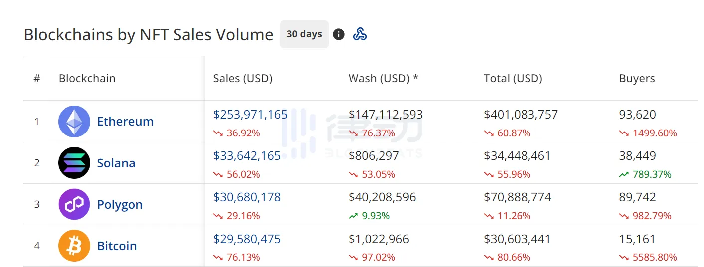 在过去的 30 天里,Polygon NFT 市场的总成交量排名第 3,与 Solana 的总成交量差距非常之小。考虑到比特币 NFT 的总成交量里包含了很多 BRC-20 Token 的成交量,Polygon 可以说是「稳 3 抢 2」的水平。