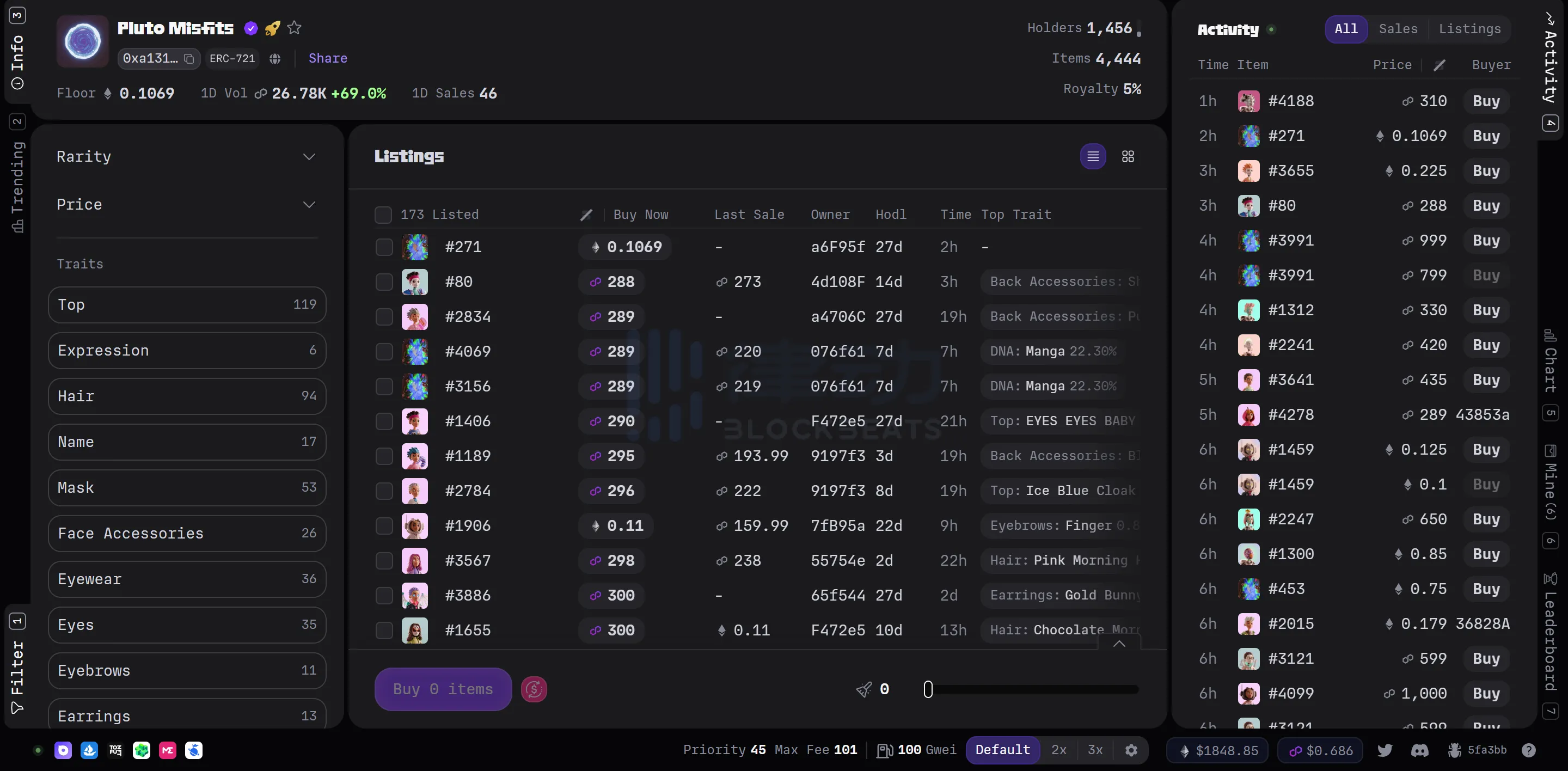 Pluto Misfits 总量 4444 个,发售价为 99 Matic,目前地板价已经来到 288 Matic。值得一提的是 Pluto Misfits 在开图后不跌反涨,整体走势平稳向上。