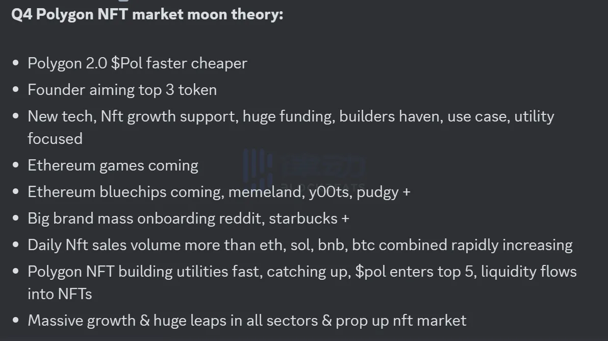 Polygon NFT 现阶段在 Web2 巨头入驻和游戏生态的发展上有突出表现,加上之前 Polygon 2.0($POL)的宣布,有些 NFT 玩家对 Polygon NFT 市场的发展有着较高的乐观情绪,甚至基于这几点提出了「Polygon NFT Q4 登月理论」: