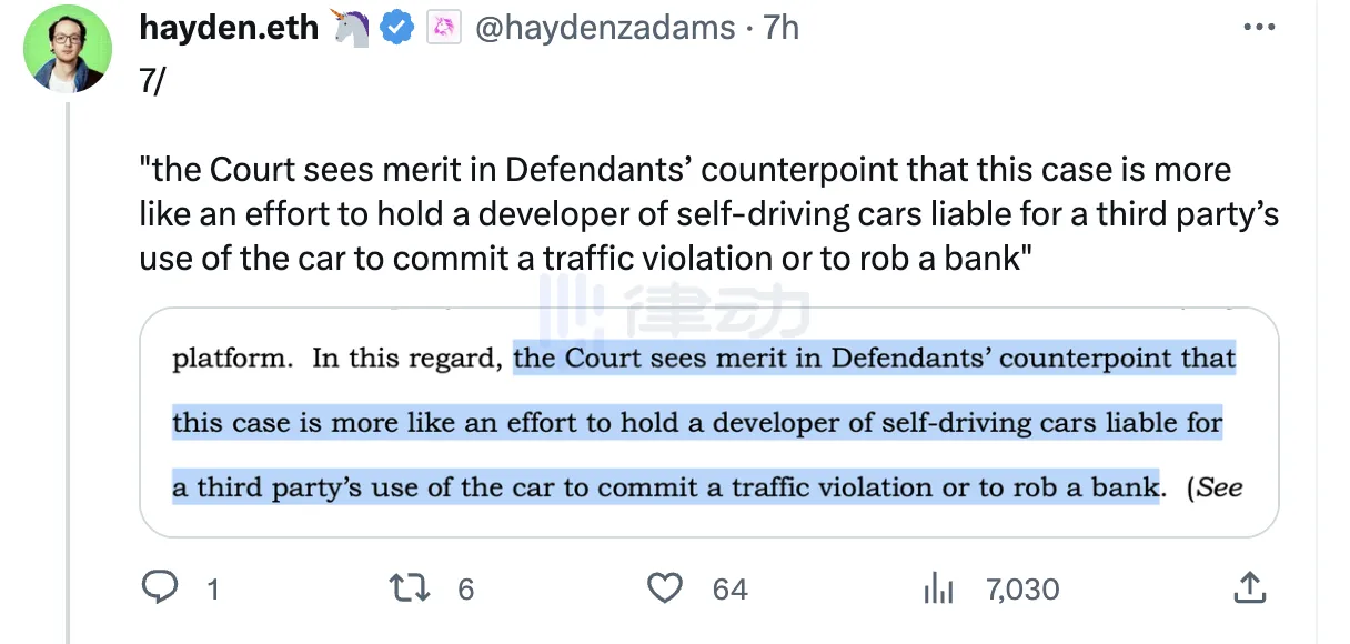 「法院认为被告的反驳有其道理,本案更像是要求自动驾驶汽车开发商对第三方使用该汽车造成交通违规或抢劫银行的行为承担责任」。Uniswap 创始人 Hayden Adams 在今天的一个长线程里,把美国纽约南区法院的一份法庭文件摘录出来,并大呼「Huge Win,DeFi 万岁!」